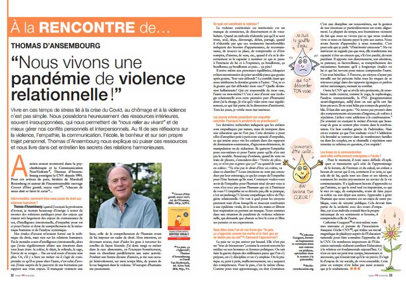 Vivre en ces temps de stress lié à la crise du Covid, au chômage et à la violence n’est pas simple. Nous possédons heureusement des ressources intérieures, souvent insoupçonnées, qui nous permettent de “nous relier au vivant” et de mieux gérer nos conflits personnels et interpersonnels. Au fil de ses réflexions sur la violence, l’empathie, la communication, l’école, le bonheur et sur son propre trajet personnel, Thomas d’Ansembourg nous explique où puiser ces ressources et nous livre dans cet entretien les secrets des relations harmonieuses.