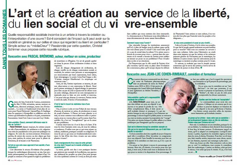 Quelle responsabilité sociétale incombe à un artiste à travers la création ou l‘interprétation d‘une œuvre ? Est-il conscient de l‘impact qu‘il peut avoir sur la société en général ou sur celles et ceux qui regardent ou lisent en particulier ? Simple acteur ou “médiaCteur” ? Passionnée par cette question, Christel Schirmer vous propose cette nouvelle rubrique.
