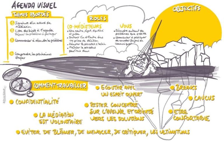 Avant chaque médiation je prépare un modèle d’agenda visuel et où sont saisies des informations pour aider à définir la structure de la médiation. Le modèle comprend une mer orageuse et une métaphore d’iceberg qui représente le conflit auquel les parties sont confrontées.